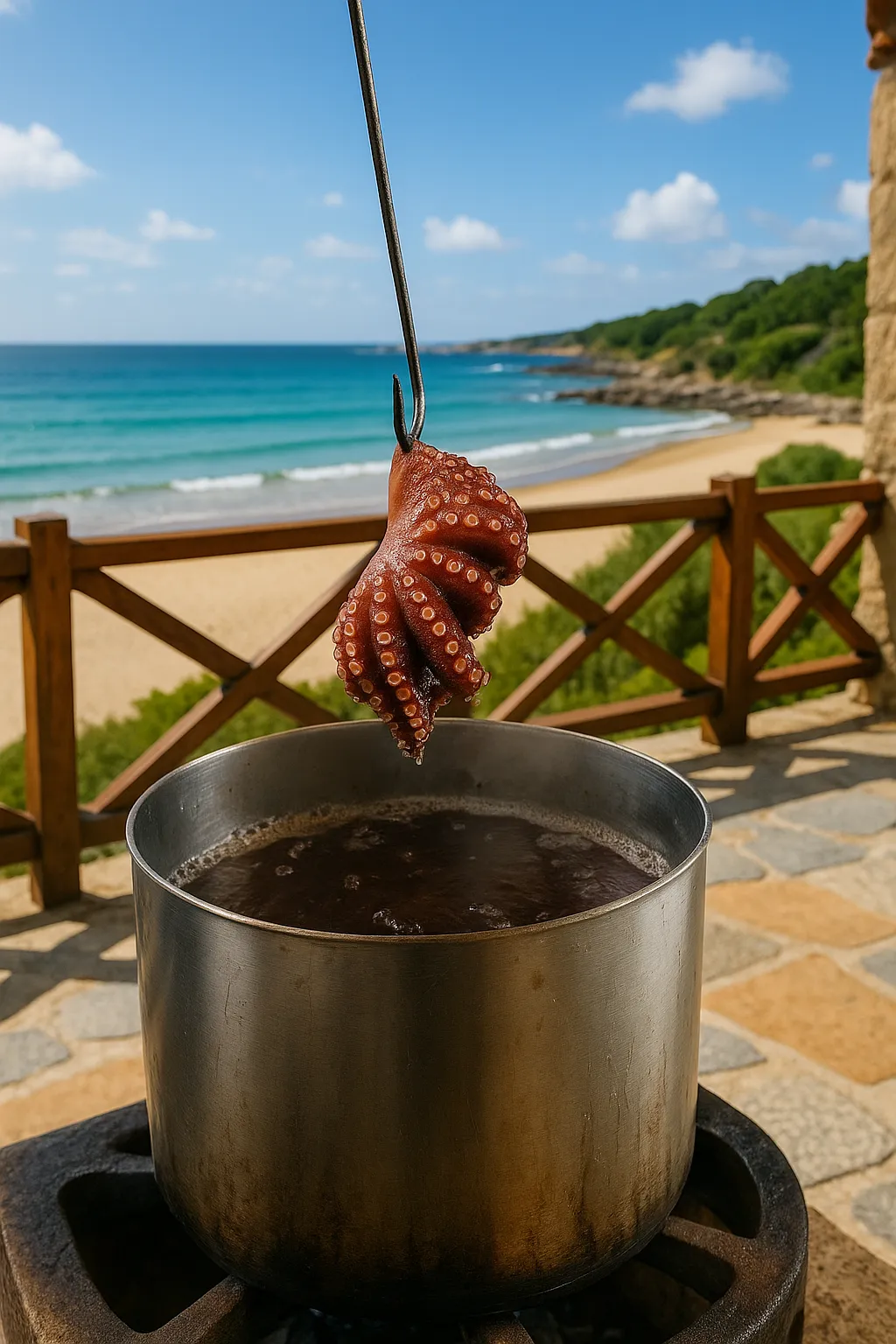 Asústalo tres veces en agua hirviendo, cuece 20–25 minutos por kilo y deja reposar 20 minutos tapado. Este proceso tradicional gallego garantiza un pulpo tierno y sabroso.